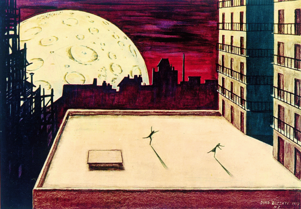 Buzzati’s Milan, by contrast, is lived from the inside. For over forty years, he worked at the Corriere della Sera‘s grand building on via Solferino and the real place becomes, in his fiction, an oneiric machine. His short stories often unfold in anonymous offices that resemble his own newsroom: spaces of routine pierced by the extraordinary. From his desk, Buzzati watched the city change: the cranes of the postwar years, the neon lights of piazza San Babila, the growing anonymity of the metropolis. Yet his gaze turned inward: the modern city, with its elevators and corridors, became a way to describe spiritual confinement. In Sessanta racconti, Milan is rarely named, but always felt: a city of fog, waiting, and unresolved transitions.