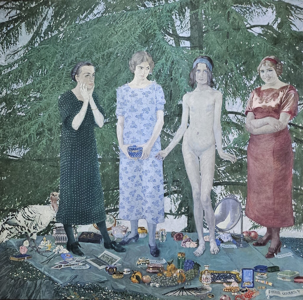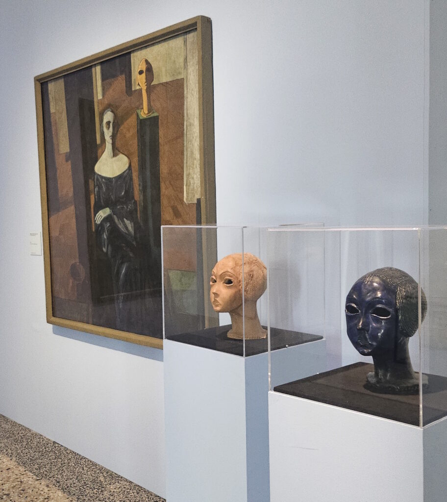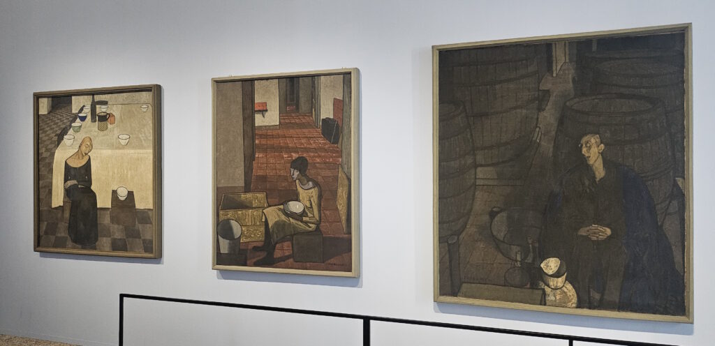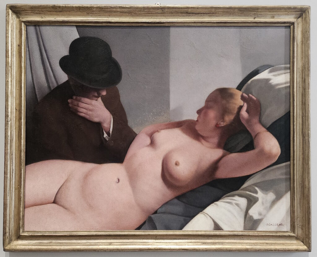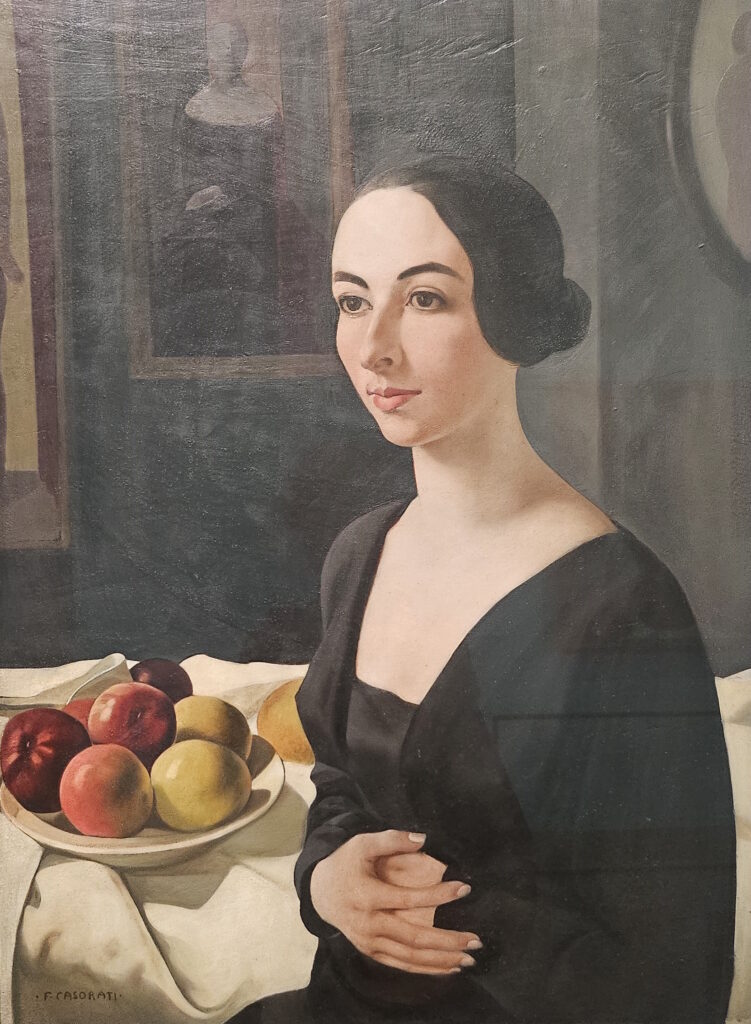The exhibition is organised chronologically across 14 rooms, tracing Casorati’s evolution from his early realist and symbolist works to his mature style characterised by metaphysical and magical realism elements. Notable pieces on display include “Ritratto della sorella Elvira” (1907), “Silvana Cenni” (1922), and “Le sorelle Pontorno” (1937).