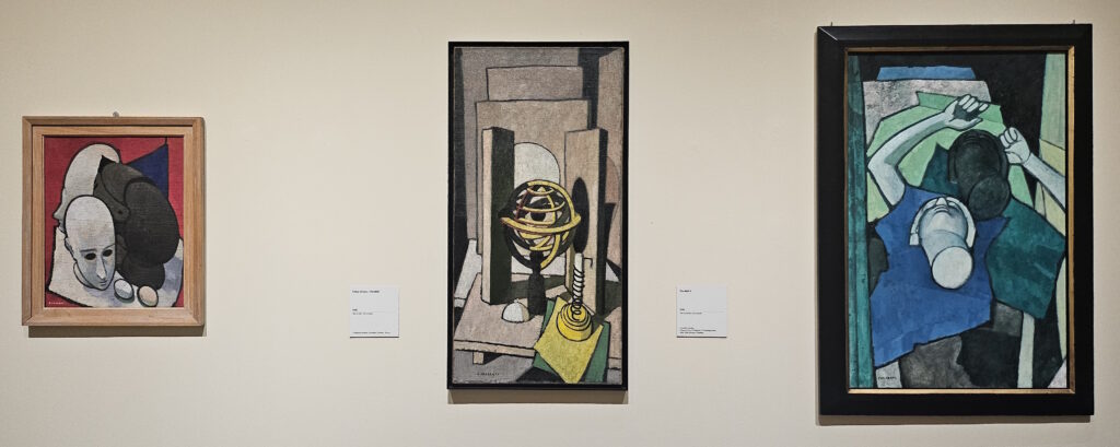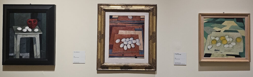 One especially inventive work is Paralleli—on the right in the picture above—where Casorati suggests the presence of a female figure using only fragments of plaster body parts placed on layered, stratified surfaces. In Eclipse of the Moon—above in the middle—he proposes what feels like a miniature theatrical set, with an astrolabe positioned at the center, flanked by two vertical panels that function almost like curtains on a stage. Then there’s Still Life with Helmet—on the left—a composition made of ovoid forms, where Casorati plays an elegant formal game with abstract undertones. The two eggs placed in the arrangement aren’t just decorative—they’re carefully chosen elements that carry symbolic and visual weight. Casorati sure loved his eggs.