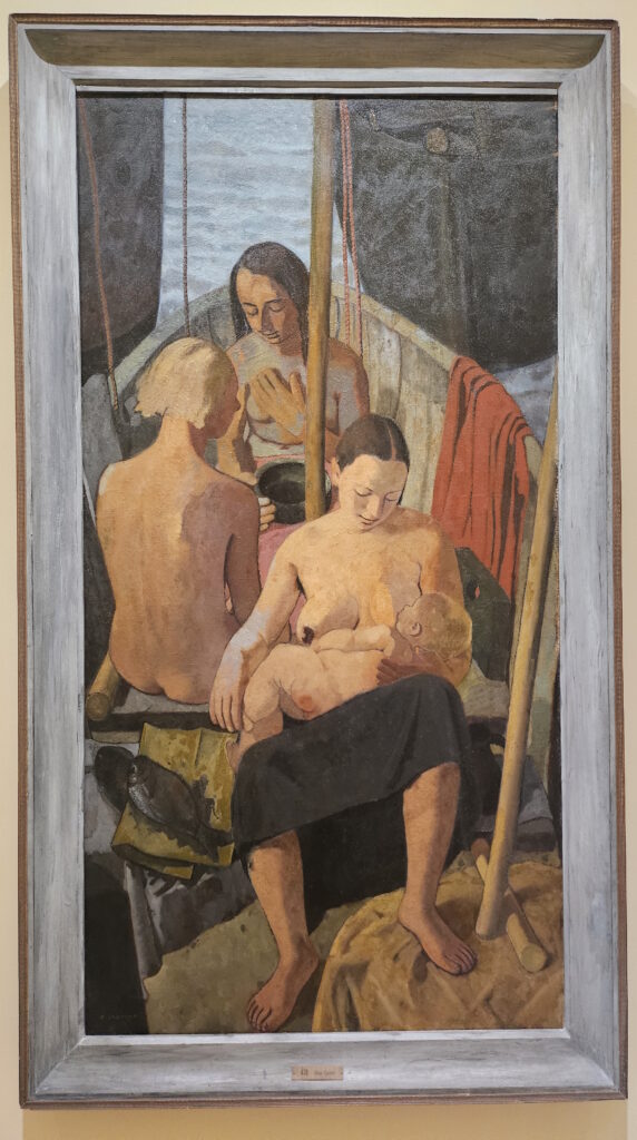 There’s an underlying tension in these scenes—a quiet, haunting unease shaped by the looming shadow of wartime. You feel it not only in Narcissus, but also in the subdued chromatic atmosphere of works like The Green Nude, where a young girl sits in a chair, and Two Women, where a wordless conversation unfolds between two female figures.