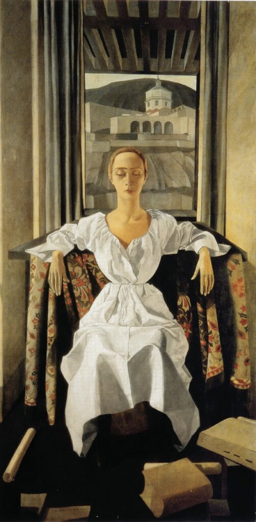 Enter Silvana Cenni, perhaps Casorati’s most famous painting. This large-scale tempera work is both monumental and intimate—a reinterpretation of Renaissance Madonna imagery seen through a modern, deeply personal lens. Painted in 1922 and measuring 205 x 105 cm, it’s widely regarded as one of the artist’s most significant and enigmatic works. The portrait depicts a woman seated on a wooden chair draped with a damask cloth. She is dressed in white, with her hair neatly gathered, her eyes closed, and her arms resting on the chair’s back, hands relaxed and lowered. Around her are books, scrolls, and various objects, suggesting an intellectual or artistic environment. Behind her, through a window, one sees fields and the distinctive silhouette of a monastery with a portico and distant hills.