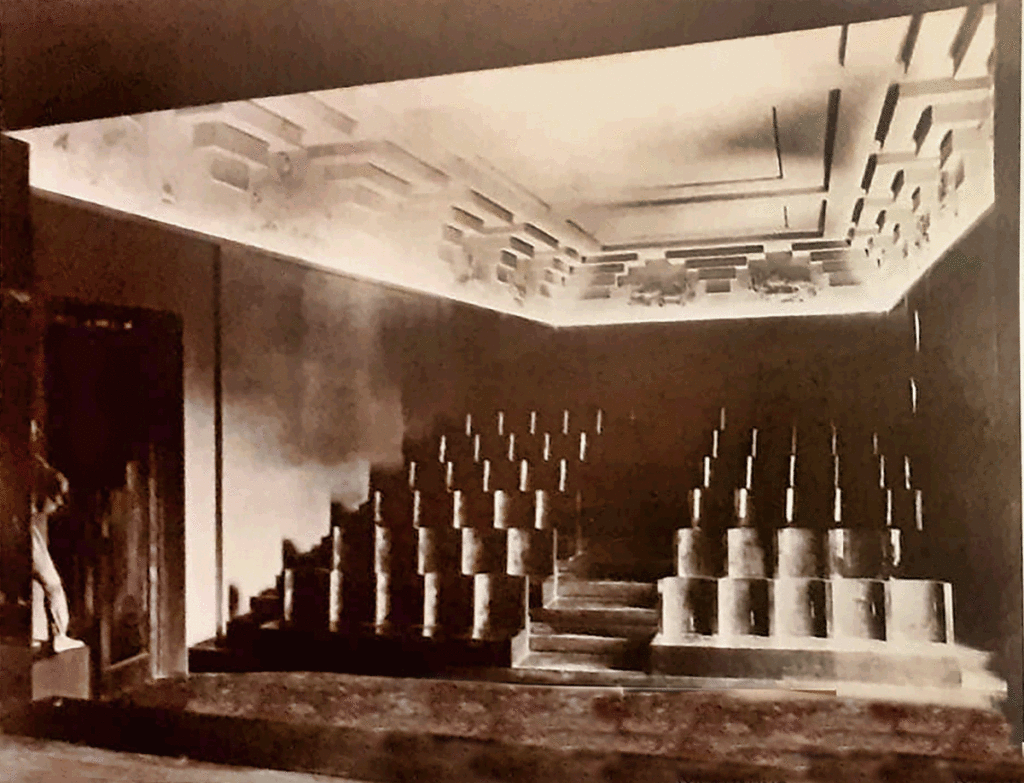 But the real jewel of this collaboration was a private theatre, dreamed up by the Gualinos and entrusted to Casorati in 1924. Designed with architect Alberto Sartoris, the space was a minimalist marvel: black seating, grey walls, and pristine white bas-reliefs (three of which are on view in the exhibition).