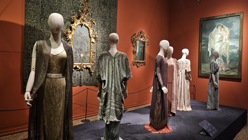 Inspired by ancient Greek sculpture, the Delphos dress was revolutionary in its simplicity and technical sophistication: made of finely pleated silk, dyed using secret processes that came from Venice’s tradition in printing, it followed the body with no corsetry, no rigid structure, no excess. The dress moved with the wearer, responding to light and gesture. Marcel Proust himself found the clothing “faithfully antique but markedly original,” and indeed Fortuny didn’t want to create a costume and didn’t copy antiquity; he translated its principles — freedom, proportion, harmony — into modern materials and techniques. Though echoing the fashion trends of Art Deco, his garments were timeless by design, intentionally detached from trends, and you could easily wear them today.