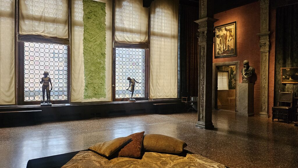 It was built in the late Gothic period and reflects the complex stratification typical of Venice. It was first associated with the Pesaro family, a prominent Venetian patrician lineage since the early 13th century whose members served the Republic as admirals, magistrates, high officials and patrons of the arts, managing to be Doge for like one year at a certain point. In the 19th century, it was known as the Orfei, a venue for concerts and musical performances. When Fortuny acquired and transformed the palace at the end of the century, he kept the spaces as hybrid spaces where medieval tapestries coexisted with photographic equipment, stage models with ancient sculptures, bolts of fabric with lighting prototypes. The palace still has this vibe today.