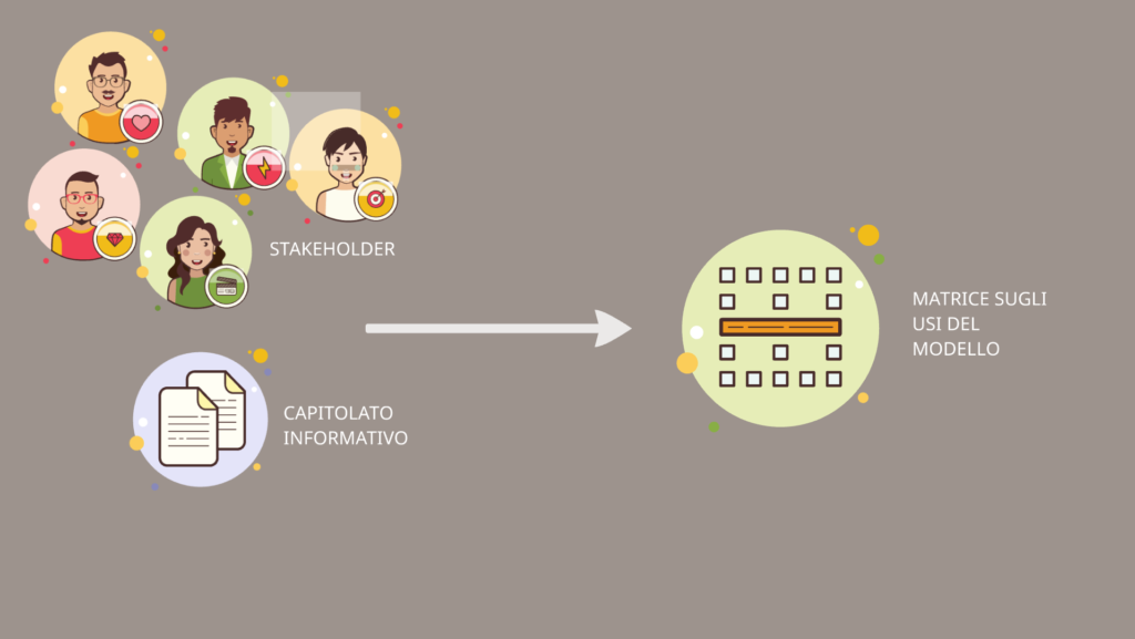 - cosa vogliamo essere in grado di fare con il modello? Una volta messi a fuoco gli obiettivi, questa porzione si occupa della loro traduzione in operazioni pratiche richieste sul modello: se l’obiettivo è la verifica di conformità normativa, l’uso potrebbe essere la verifica dei RAI.