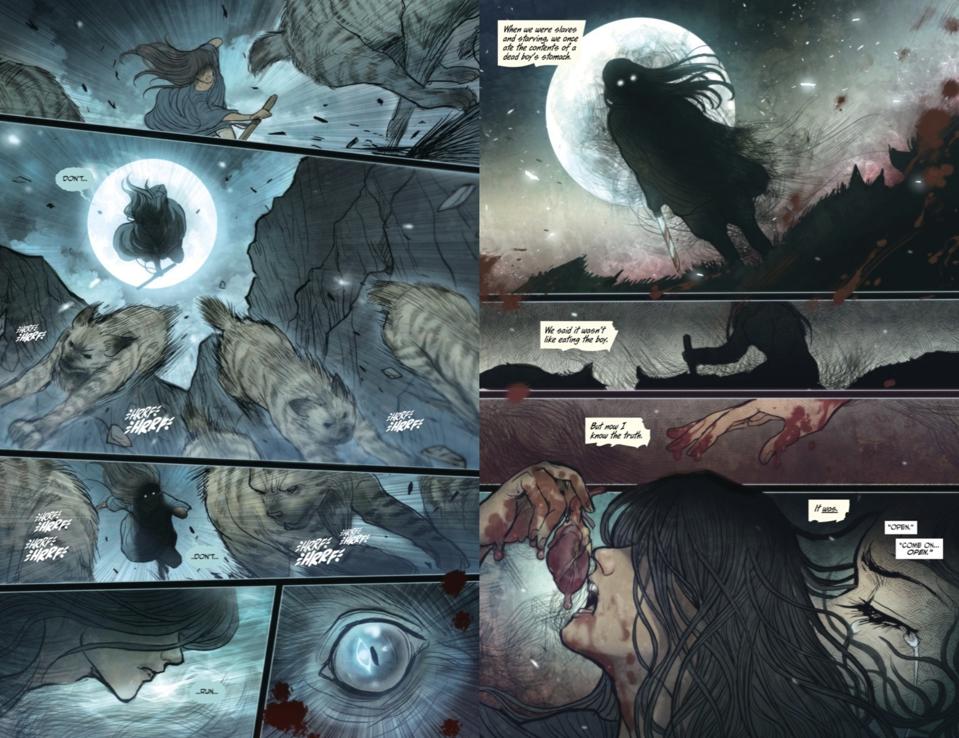 As it unfolds throuh the first volume (a collection of issue #1 through #6), the main story is pretty standard: a teenage warrior goes into an enemy’s stronghold to learn more about her dead mother, only to discover her mother’s relationship with the enemy witches was closer than she realised. Oh, and the girl is possessed by a daemon who sometimes springs out and murders everyone.