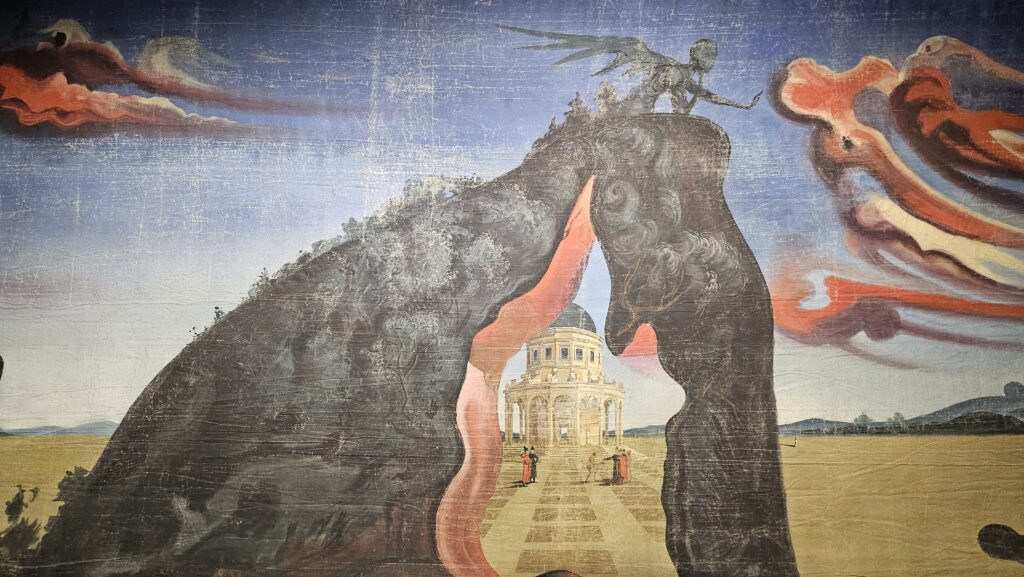 The plot of what was supposed to be the first work of a trilogy recounts the arrival of Ludwig II of Baviera, the Fairytale King, at a mountain sacred to Venus: he encounters the goddess, fights her in the form of a dragon (so to say), and eventually sees mannequins, Leda, eggs, swans and, being Dalì, the umbrella of death. The whole thing has references from Raphael, Michelangelo, and Böcklin in equal measure, and the exhibition features a video recording in a loop and the original backdrop of the ballet.